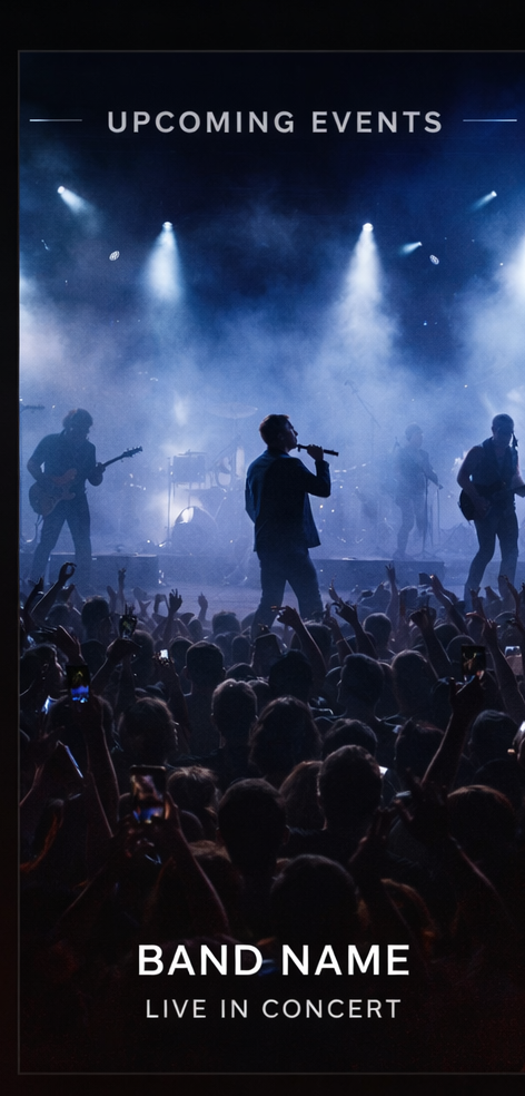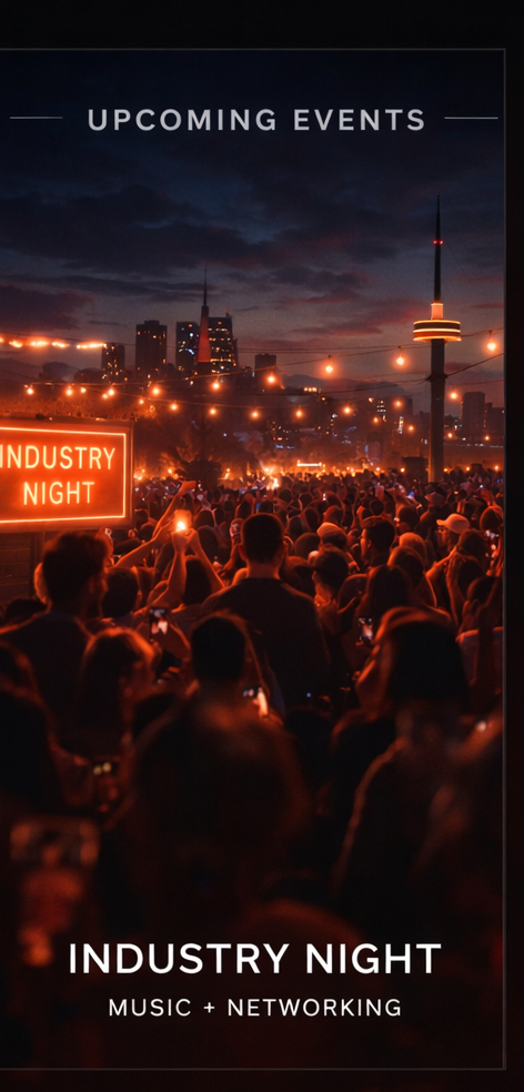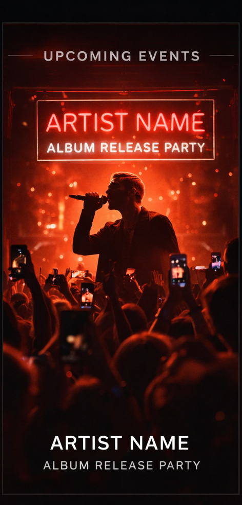 The Events page should make the company feel active, current, and entertainment-driven. It is where live movement, artist visibility, and branded momentum come together.